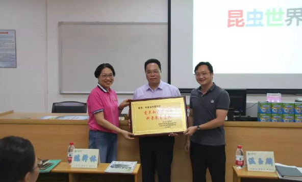 市愛衛(wèi)辦主任溫玉麟和廣東新希望城市害蟲防治有限公司董事長王新艷女士向東莞市可園中學頒發(fā)“愛衛(wèi)知識進校園活動”科普教育基地牌匾。